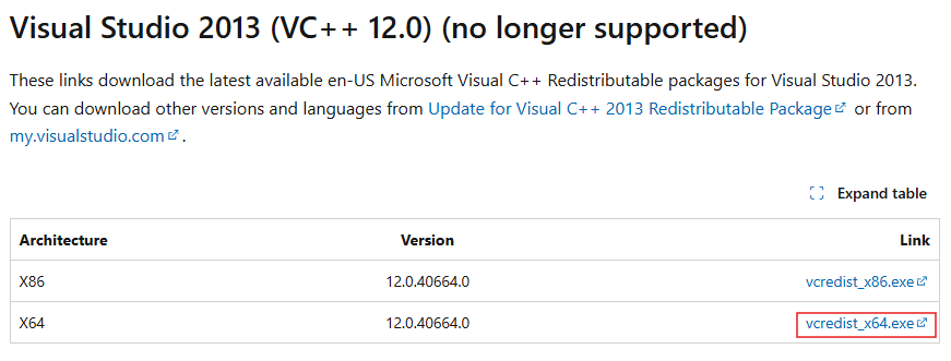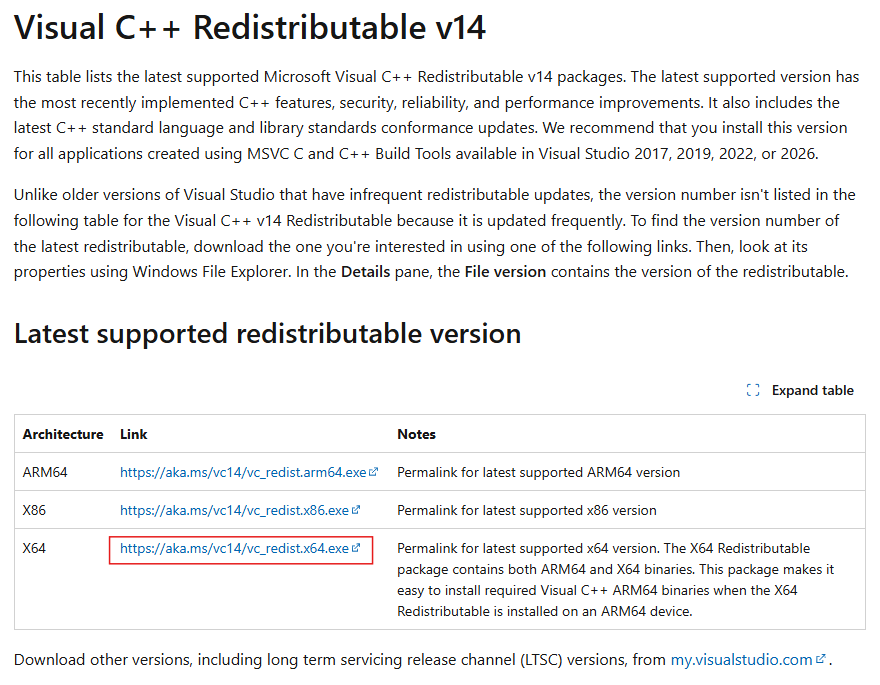 To resolve this, click here and install the v14 (2017 - 2026) and 2013 x64 packages:
