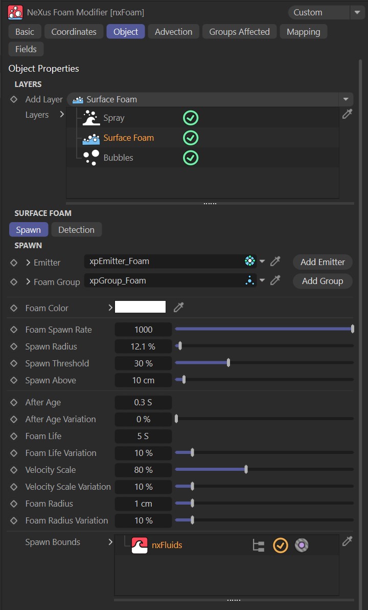 Enrich your NeXus fluid simulations with foam particles for added realism. This layered system generates spray, foam and bubbles based on fluid detection properties like kinetic energy, wave curvature and turbulence. Full advection controls let you fine-tune how each particle type interacts with your simulation, from buoyancy and drag to surface erosion effects.
